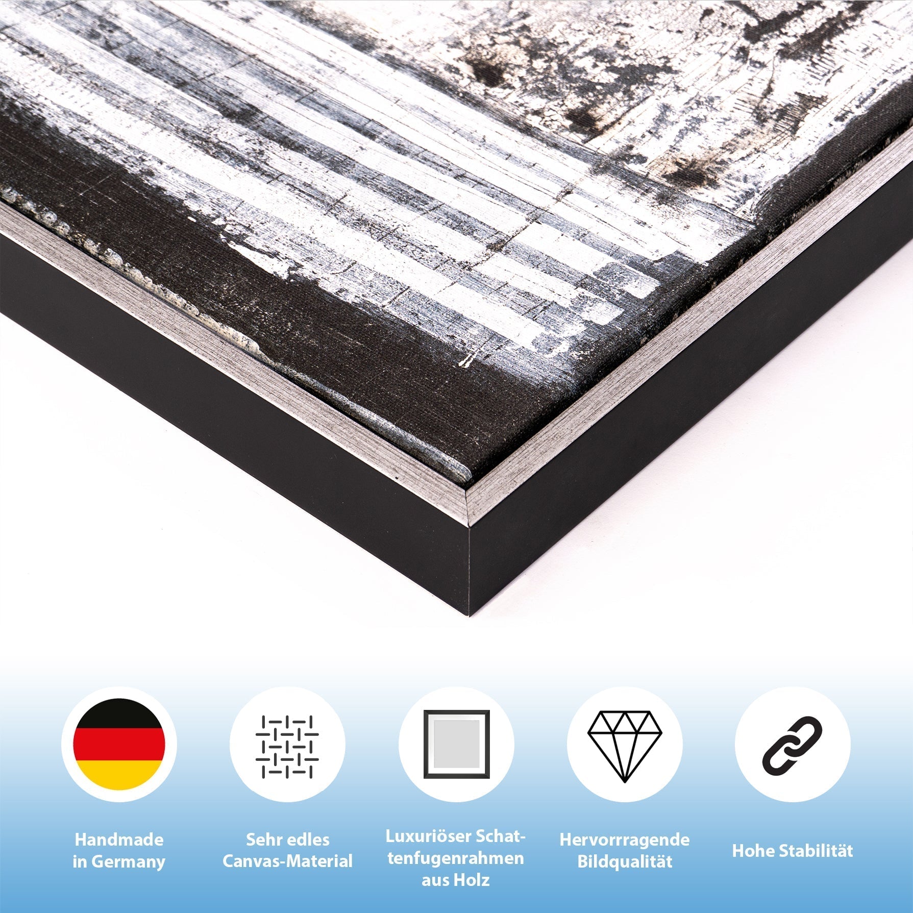 Fix und fertig zum Aufhängen. Auf der Hinterseite haben sie eine Einkerbung zum Aufhängen. Die gerahmten Leinwand-Kunstdrucke werden einzeln in unserer Werkstatt in liebevoller Handarbeit auf Keilrahmen gespannt und anschließend mit einem Schattenfugenrahmen veredelt.